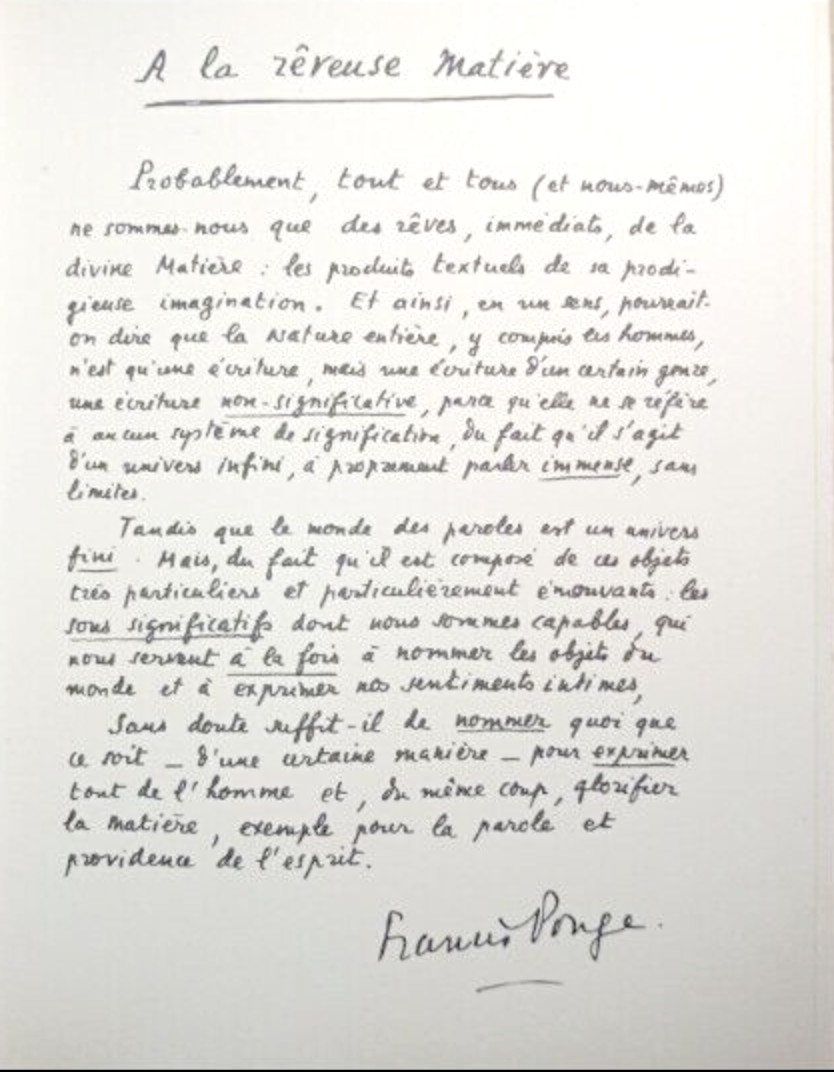 Sans doute suffit-il de nommer quoi que ce soit — d’une certaine manière — pour exprimer tout de l’homme et, du même coup, glorifier la matière, exemple pour la parole et providence de l’esprit.